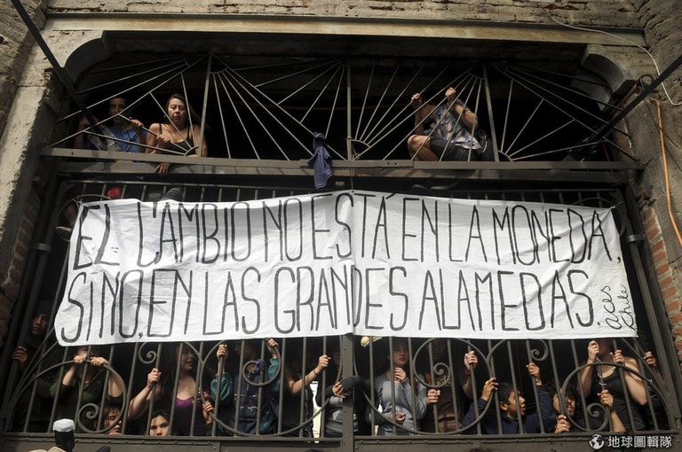 學生們舉著旗幟,上面寫著「改變不是從總統官邸開始,而是從聖地牙哥的阿拉曼達斯大道開始」。當地在周日(17)舉行大選,他們現在質疑前總統巴契雷特(Bachelet)選贏的公正性
