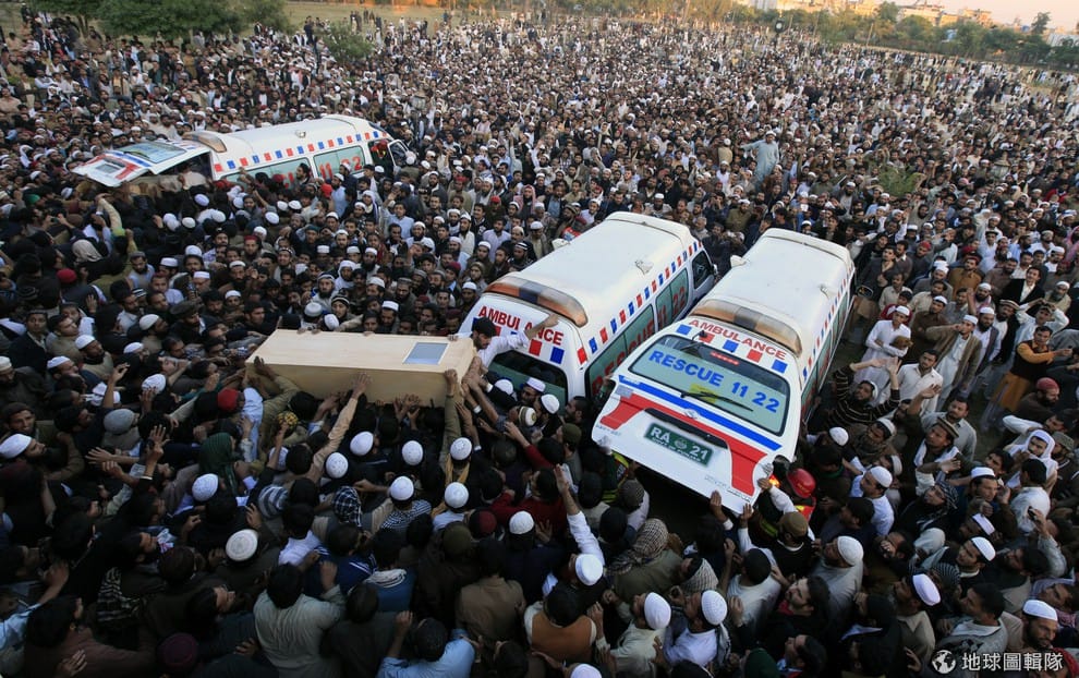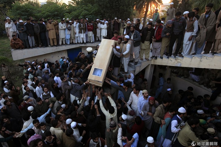 遜尼派的穆斯林們正合力把同樣是遜尼派人士的棺木抬起來。上周五一場宗教派系間的衝突讓8人死亡、30多人受傷。宗教派系間的衝突激增下,巴基斯坦政府也下令宵禁