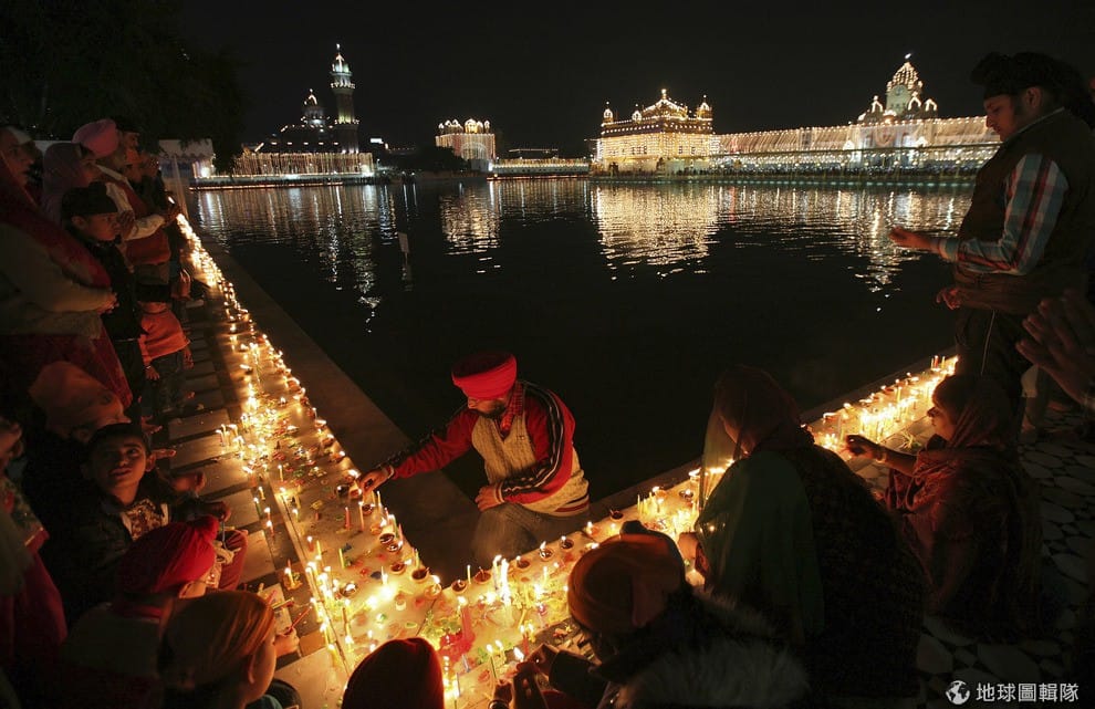 印度錫克教的信徒們正點燃燭光,他們身後的是錫克教的黃金寺廟(Golden Temple),這天是他們信仰的精神領袖大師(Guru)Nanak Dev的544歲誕辰紀念日