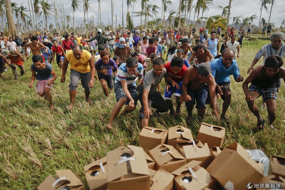 風災災民們衝向前搶拿美軍投下的新鮮飲用水。當地許多飢餓的村民搶著美軍空投物資,他們也聚集到頹圮的教堂中不斷禱告祈求庇佑。目前已知有3,681人在風災中喪生,1,186人失蹤,儘管國際救援團隊和物資不斷湧入菲律賓,許多偏遠地區仍無法得到協助