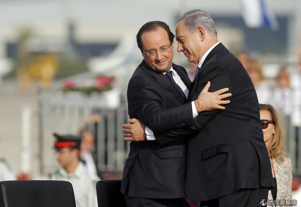 照片中左邊的法國總統歐蘭德(Francois Hollande)和以色列總理納坦亞虎(Benjamin Netanyahu)相擁,歐蘭德將在以色列進行三天的訪問