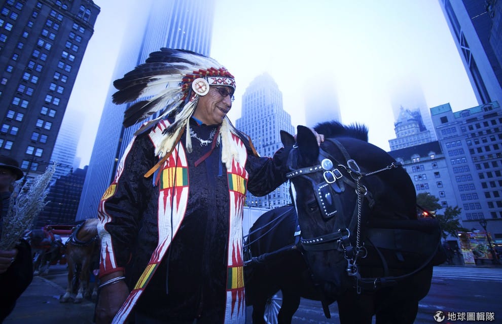 阿爾佛酋長(Chief Arvol)正和中央公園內的馬匹說話,他是蘇氏部落聯盟的精神領袖(Spiritual Leader of the Great Sioux Nation)。阿爾佛酋長來到紐約市,希望能結束紐約中央公園長期以來的馬車服務,新上任的紐約市長德布拉西奧(Bill Di Blasio)也支持這項決定