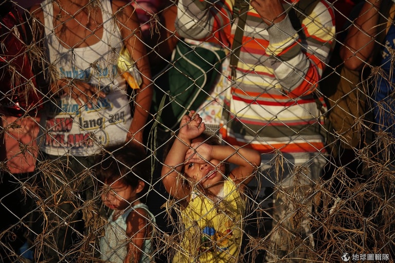 想逃離災區的民眾從柵欄中向外望。