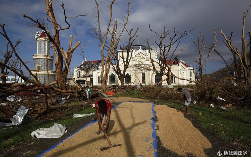 居民站在陽光下,想把稻米弄乾。在許多救援物資抵達災區前,海燕風災的災民們必須找方法維生。海燕颱風重創菲律賓中部地區,目前有許多災民亟需救援