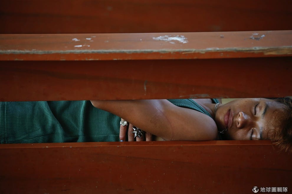 一名從災區中撤離的災民在教堂中的長椅上睡著,她的嘴中放著她在災區找到的十字架