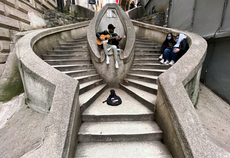 一名街頭藝人坐在城市伊斯坦堡(İstanbul)的卡莫多階梯(Kamondo Stairs)上高歌,希望可以獲得路人的青睞打賞。