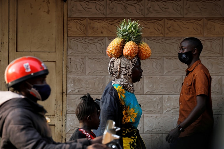 一名婦女頂著鳳梨穿梭在街道上,對她來說是個再平常不過的一天。