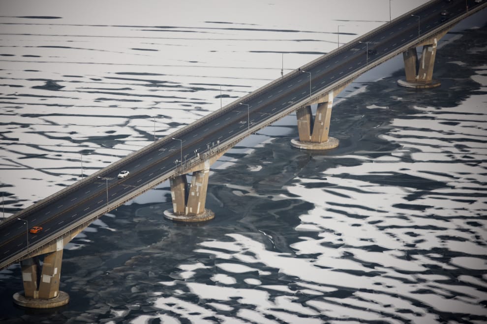 熙來攘往的車子穿梭在漢江大橋下。可以看到漢江因為天氣回溫而解除了先前完全凍結的狀況。