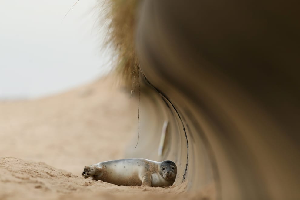 來到以海豹棲息地聞名的霍西海灘(Horsey Beach),一隻小灰海豹被攝影師給捕捉了下來。