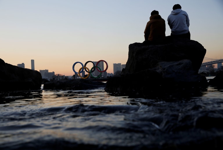 在東京一角,兩名男子坐在石頭上看著眼前的奧運五環標誌。