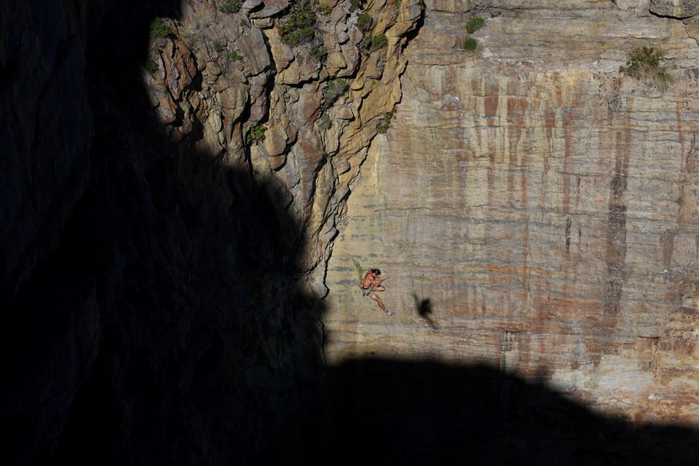 在新南威爾斯州的臨海村莊Currarong,一名冒險運動愛好者在海岸邊的懸崖上挑戰極限。