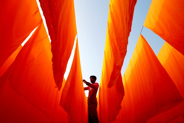 在一家染布工廠裡,一名工人忙著曬乾剛剛染好色的布料。