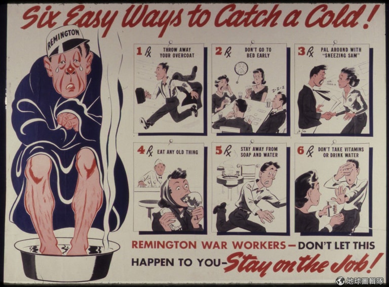美國國家檔案管理局( National Archives and Records Administration )提供的圖片中,可以看到以前叮嚀小心感冒的內容,像是多穿點、別熬夜、避免跟感冒人接觸、少吃冰、勤洗手、還有補充營養品。這些叮嚀到現在也依然適用(open credit: wikicommons)