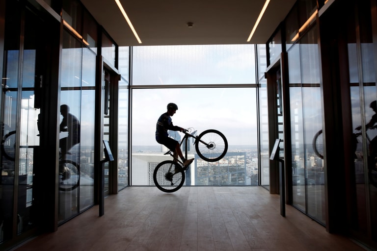 在巴黎拉德芳斯(La Défense)金融區,法國專業登山車好手豐特努瓦(Aurelien Fontenoy)靠著他的登山車征服了有 768個台階、33層樓、140公尺高的三一塔(Trinity Tower)。