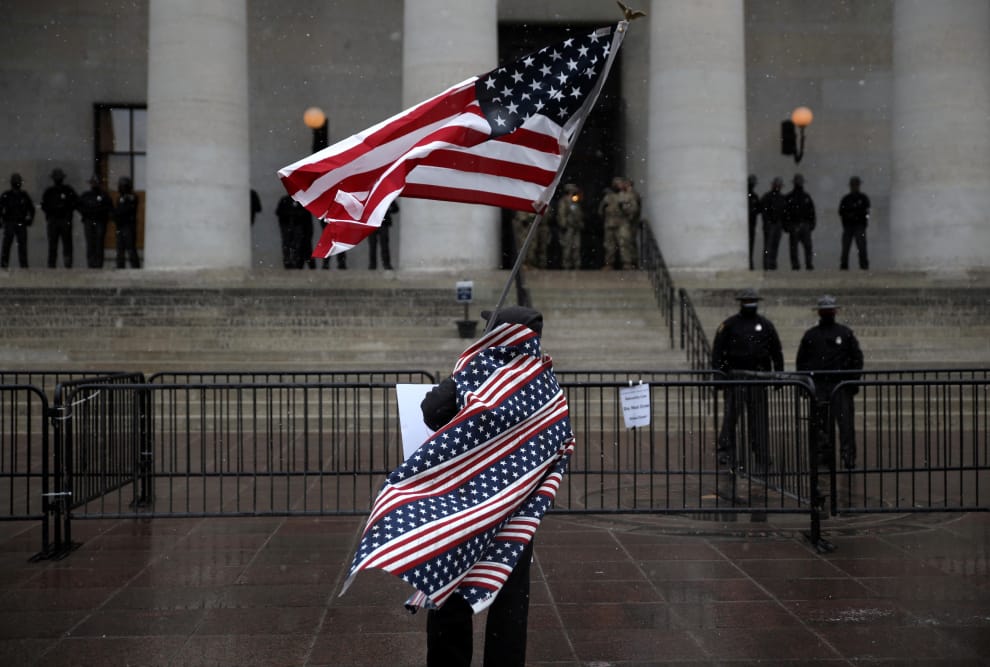 在俄亥俄州的國會建築前,美國總統川普(Donald Trump)的支持者手持國旗,抗議美國總統當選人拜登(Joe Biden)即將在 20號就職成美國第 46屆總統。