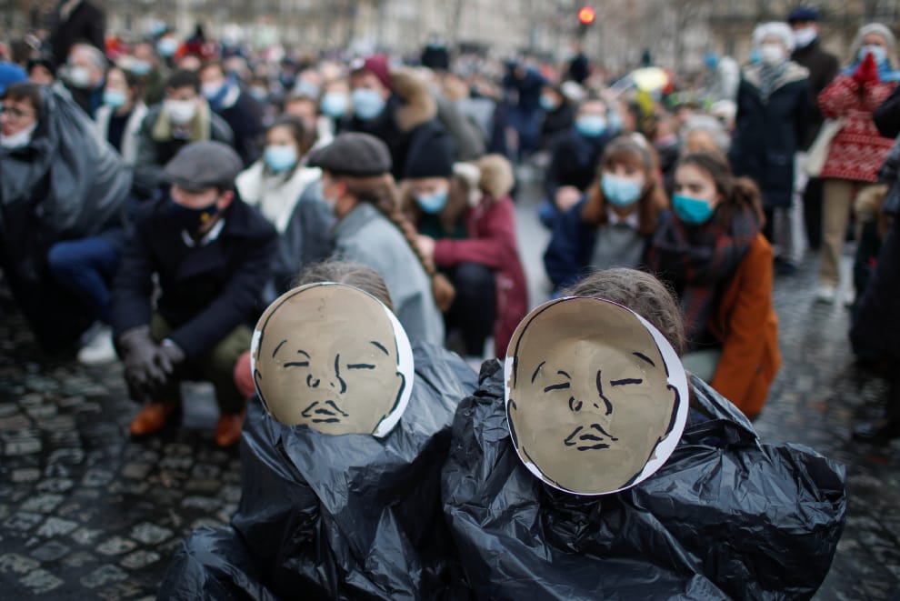 在巴黎鐵塔附近的特羅卡德羅廣場(Trocadero square),參加「為生命遊行」(Marche Pour la Vie)反墮胎活動的民眾戴上自製的寶寶面具。