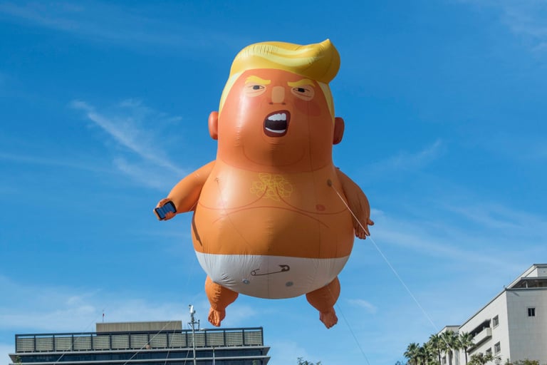 2018年7月13日是川普任內首度出訪英國的日子,但大批倫敦的反川普示威者一點都不想歡迎他,決定組織大型示威活動表達不滿。當時,有人便發起群眾募資籌措製作氣球的經費,並向倫敦市政府申請許可,希望能在 13號當天在倫敦國會廣場(Parliament Square)上升起氣球。