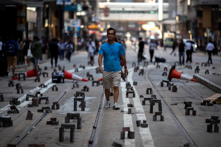 當成千上百個小ㄇ字形的磚頭組合在街頭一次擺開,便能有效拖延警方推進的速度,比起常見的燒輪胎、架欄杆等手段方便許多。
