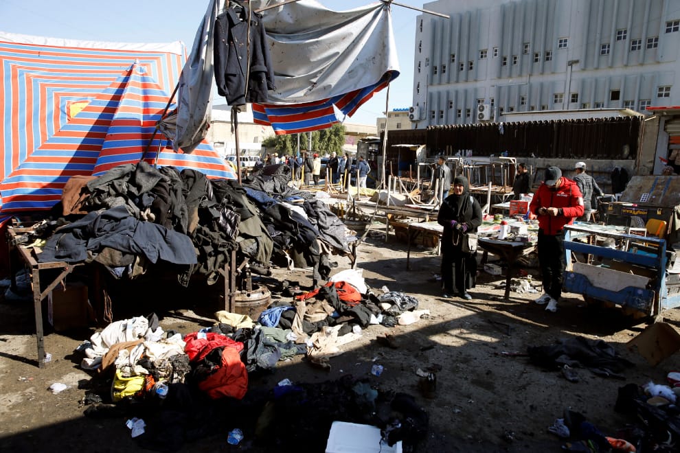 在首都巴格達的中央市場,可以看到雙胞胎自殺炸彈客發動攻擊後的現場。這場攻擊造成至少 32人死亡、數十人受傷。目前尚未有組織出面扛責,但伊拉克軍方強烈懷疑是恐怖組織伊斯蘭國(IS)在幕後策劃。