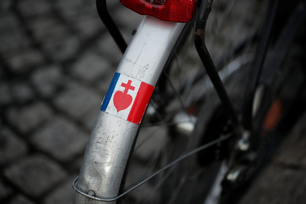 在巴黎協和廣場,一輛腳踏車貼上了帶有愛心和十字架的貼紙,和在廣場上的民眾一起紀念 228年前,被處決的法國國王路易十六(Louis XVI)。