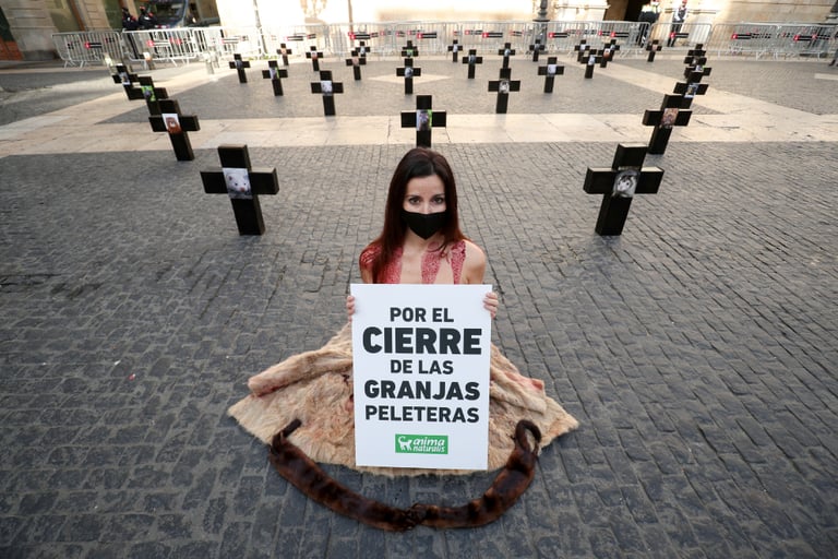 在巴塞隆納的聖若梅廣場(Sant Jaume Square),一名裸體的動保人士拿著寫有「關閉皮草工廠」字樣的看板,和身後的動物十字架一起呼籲大眾不要再購買皮草。