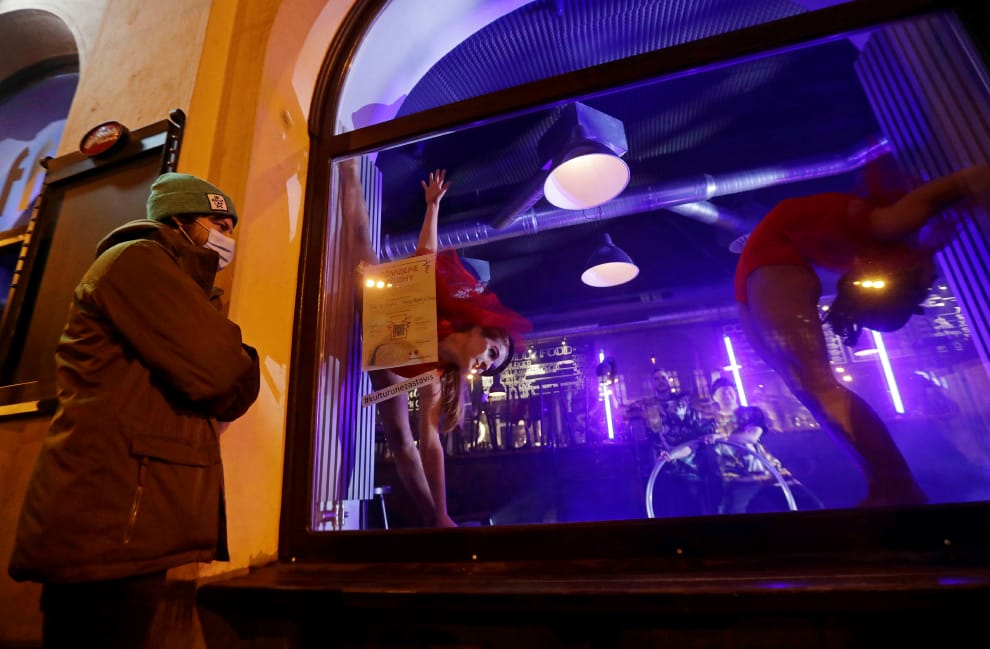 在布拉格一間因為防疫封鎖令關閉的酒吧外,民眾看著落地窗內正在表演的舞者。