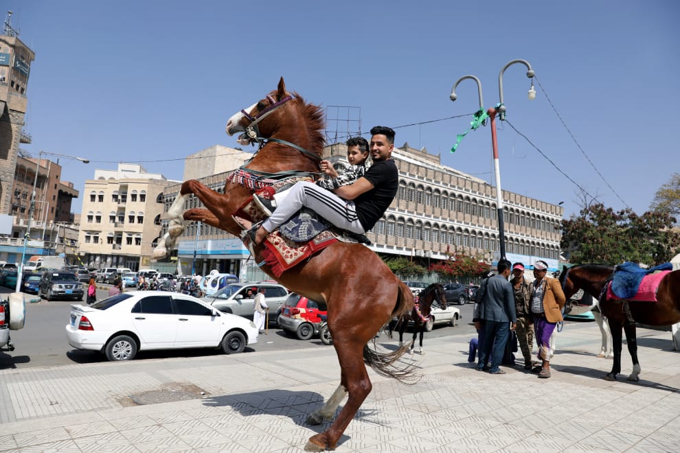 在首都沙那的塔里爾廣場(Tahrir Square),一對父子正在騎馬。過去,反政府胡西組織(Houthis)常常在這裡公開處刑反對胡西組織、支持政府的人。