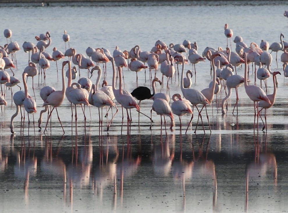 在拉納卡城(Larnaca)的鹽水湖,可以看到全是紅色的火鶴中出現了一隻黑色的火鶴。