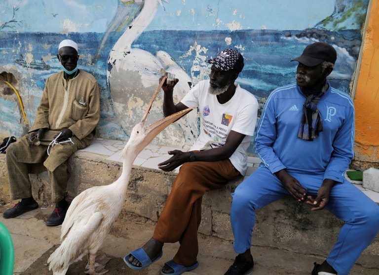 在首都達卡(Dakar),一名男子正在和他飼養的鵜鶘玩。