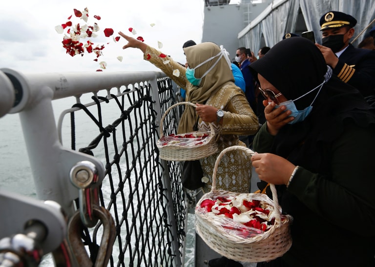 在印尼斯里維加亞航空(Sriwijaya,也稱三佛齊航空)的失事現場,罹難者的親友將花瓣撒向大海,悼念他們永遠回不來的親友。