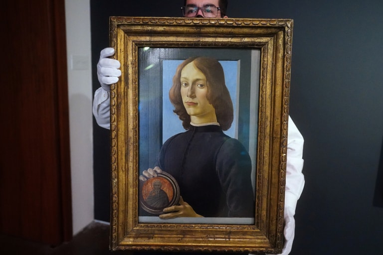 在紐約市,一名蘇富比拍賣行(Sotheby's Auctions)的工作人員拿著義大利文藝復興畫家波提切利(Sandro Botticelli)的作品《拿著紀念章的年輕人》,希望可以拍得超過 8,000萬美元(折台幣約 22億5,960萬元)。