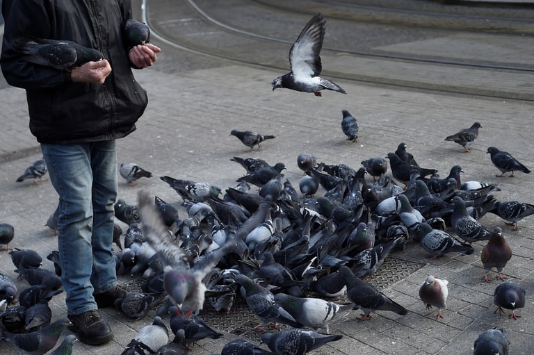 在都柏林(Dublin)的市中心,一名男子讓鴿子們在他的手臂上進食。