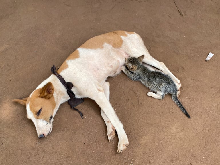 在奧貢州(Ogun state),一隻狗狗被目擊到正在哺育一隻小貓。