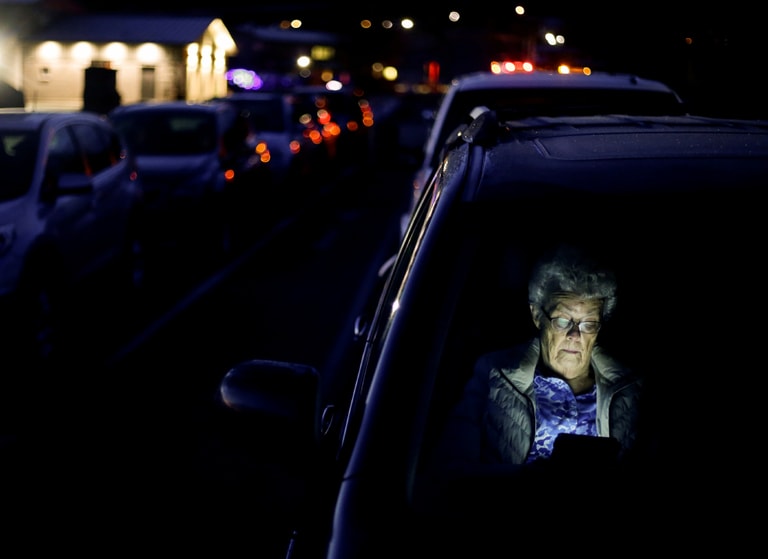 在華盛頓州的史魁恩(Sequim)的清晨六點,一名 81歲的婦人待在車上滑平板,並等待施打疫苗。