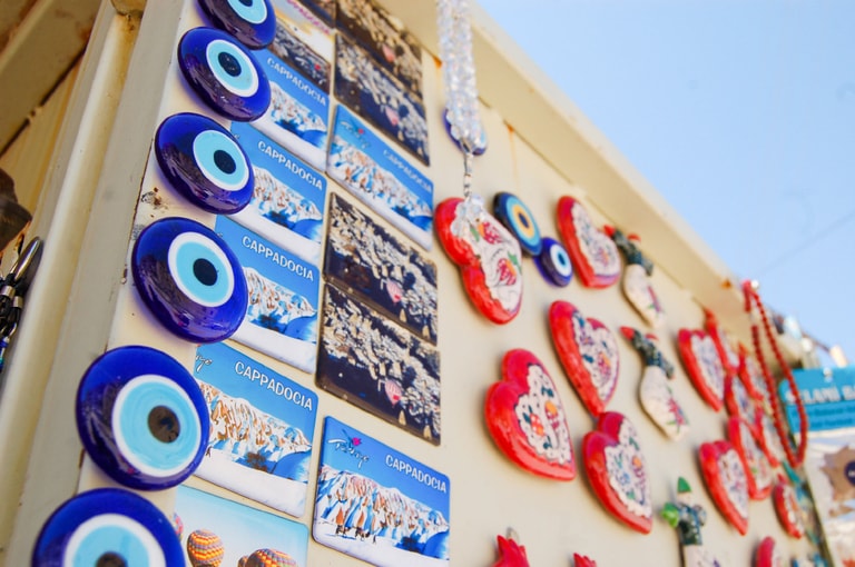 在土耳其,人們認為他人出於忌妒或惡意的注視具有邪惡的力量,會讓被注視者惡運纏身,這可說是一種日常生活中看不見的詛咒。因此,為了避免他人不懷好意的注視,人們會佩戴「邪惡之眼」護身符(nazarlik)──這種藍底黑點的玻璃飾品相傳可以祛除詛咒,並且保護佩戴的人。