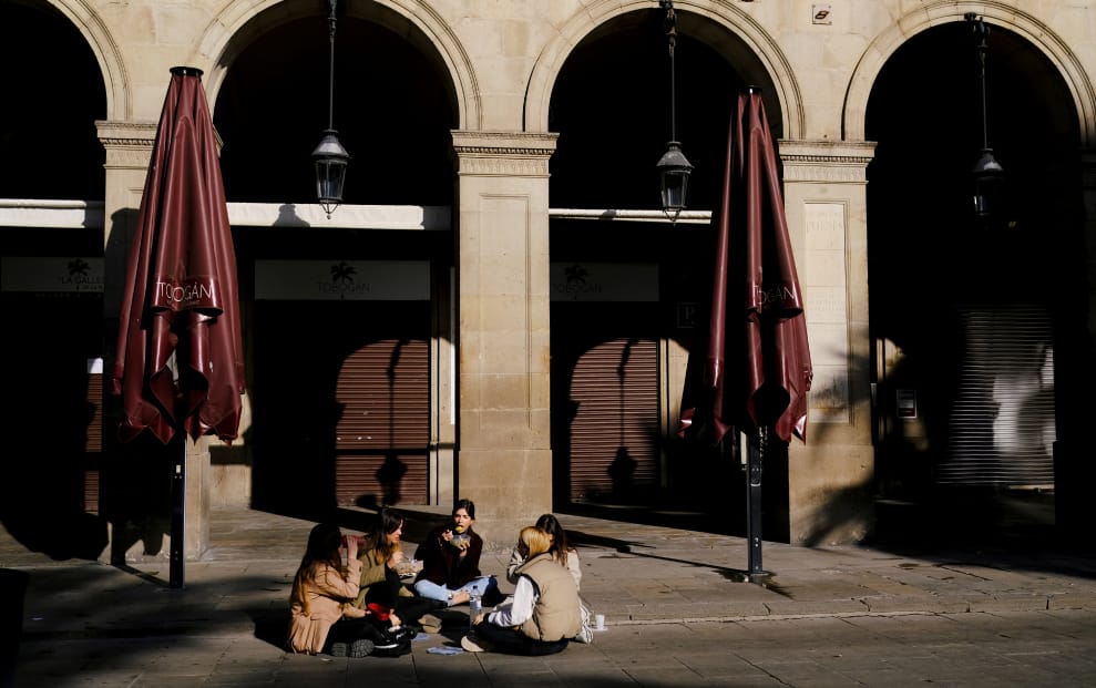 在城市巴塞隆納(Barcelona)的皇家廣場(Plaza Reial),一群女子坐在因為疫情而關閉的餐廳前面野餐。