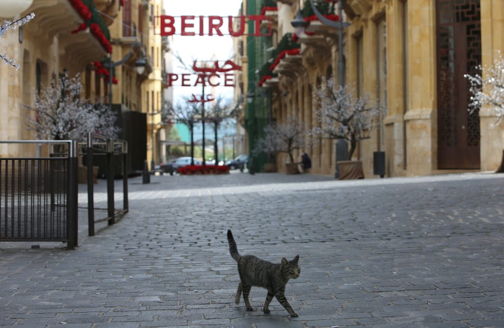 在首都貝魯特(Beirut)的市中心,一隻貓獨自走在因疫情封城而空蕩蕩的街頭。