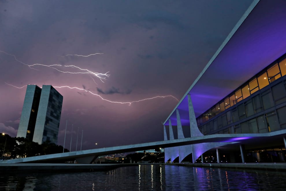 在首都巴西利亞(Brasilia),一道閃電掠過國會大廈跟普拉納托宮(Planalto Palace)的上空。
