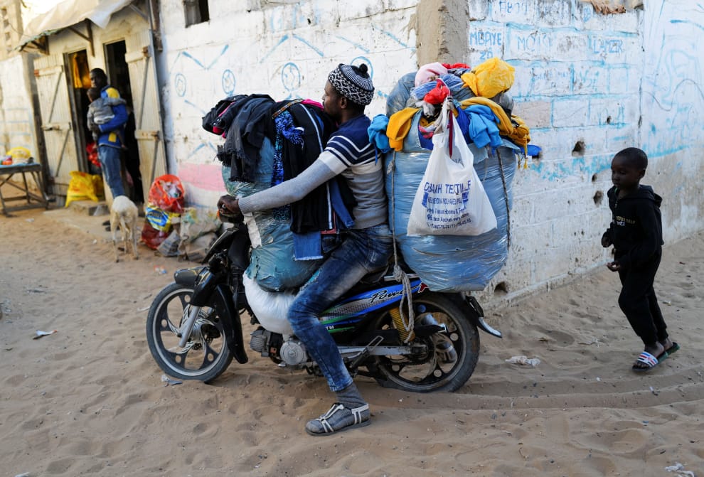 在首都達卡(Dakar),一名攤販用摩托車載著他的商品們,東西多到甚至快要遮住他的視野。
