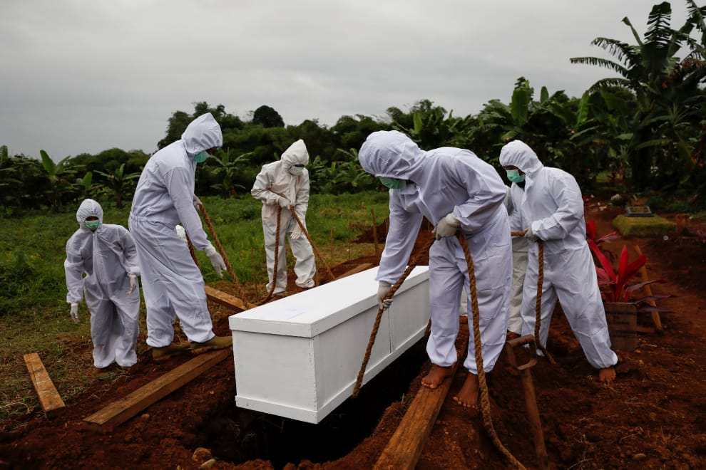 在城市茂物(Bogor)一處因COVID-19(武漢肺炎)而特別規劃的墓地,一群穿著防護衣的人們正在下葬不敵病魔的亡者。