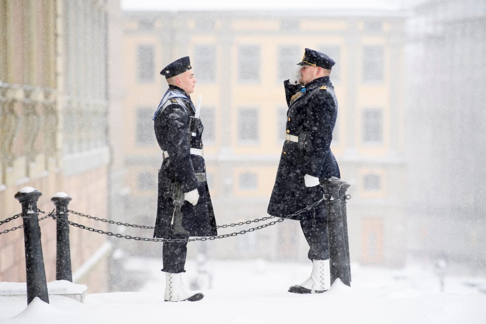在首都斯德哥爾摩(Stockholm),兩名皇家警衛站在斯德哥爾摩王宮(the Royal Palace)外對話,細雪染白了他們的制服。