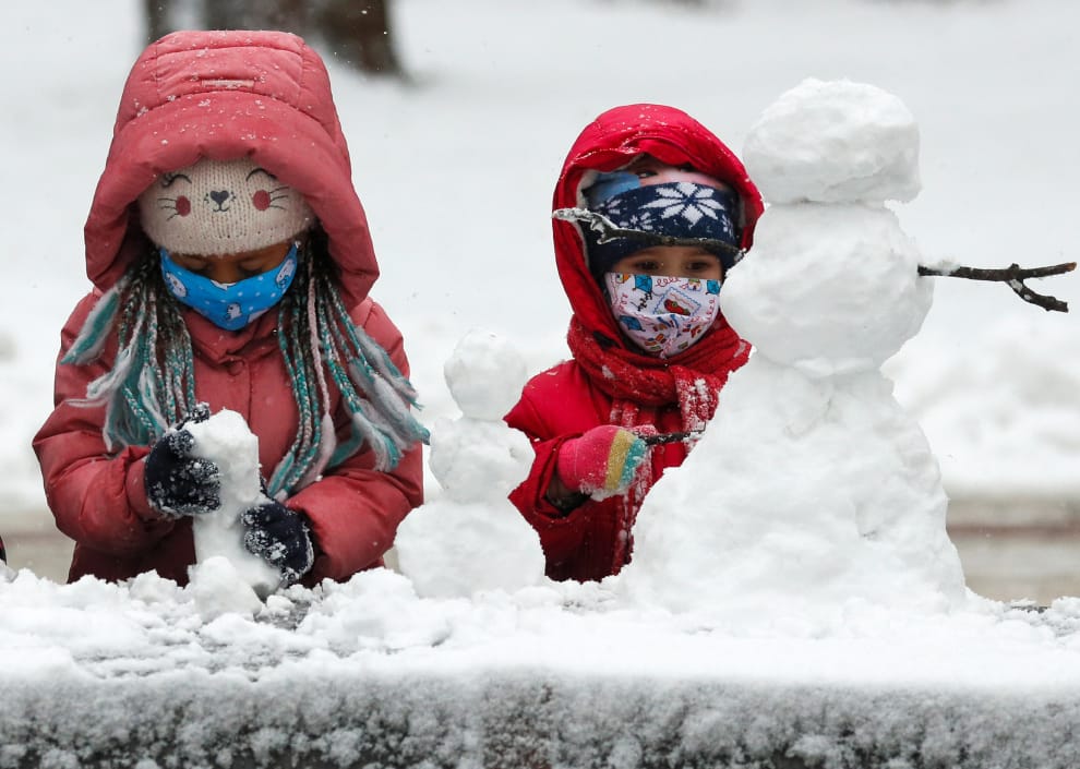 在首都基輔(Kyiv),孩子們在大雪過後的公園堆著雪人。