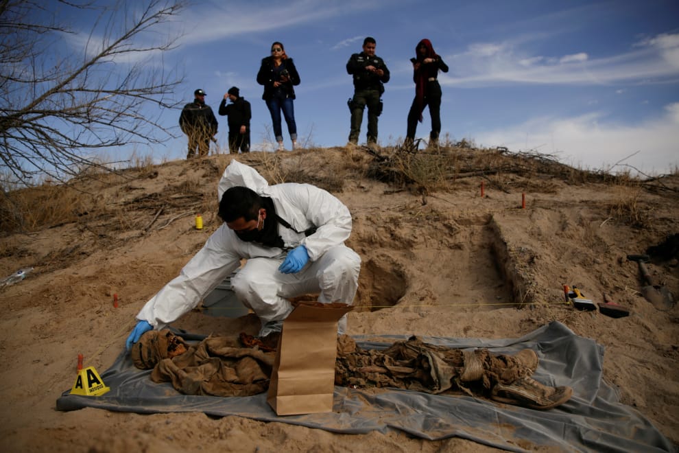 在自治區瓜達盧佩(municipality of Guadalupe),國家檢察署正在尋找因為私刑暴力而存在於國家各地的秘密墳墓。一名鑑識人員正在對發現到的殘骸進行查看。