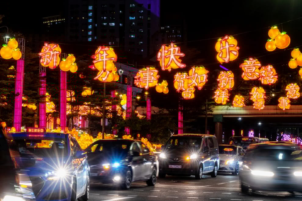 在新加坡的中國城,慶祝新年的燈飾已經高高掛起,橫越了整條馬路,照亮了夜晚。