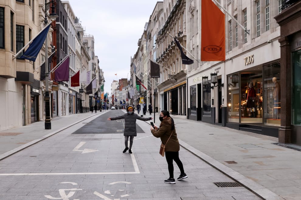 兩名民眾在倫敦的舊龐德街(Old Bond Street)拍照,四周一片冷清。龐德街是倫敦市中心著名的購物街,平時十分熱鬧,如今卻因疫情的關係而罕見人影。