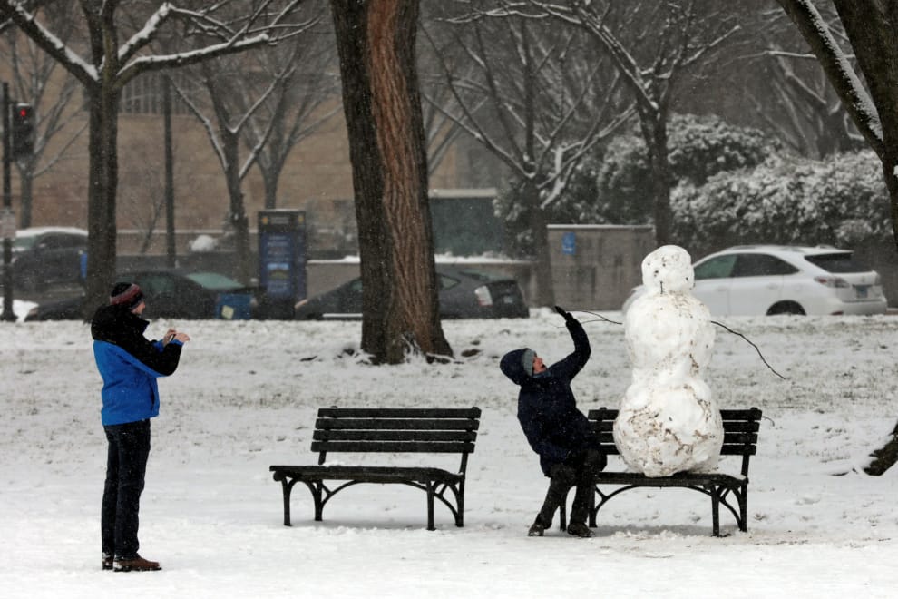 在華盛頓特區的國家廣場(National Mall),一名雪人站在路旁的長椅上,路過的女子和他擊掌,一旁的人則幫忙為這一刻留影。