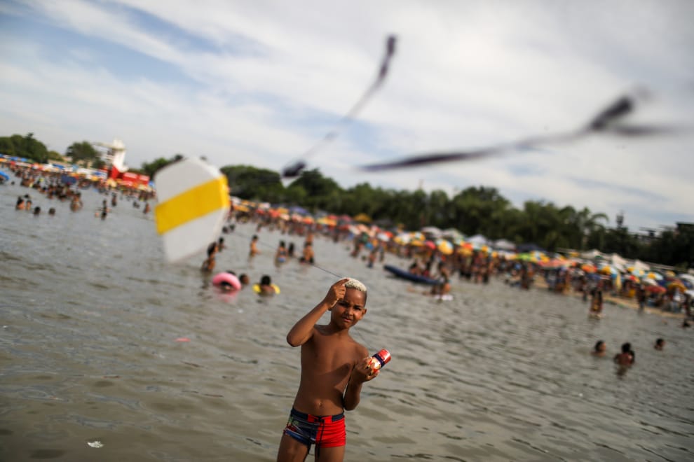 在里約(Rio de Janeiro)的人工池子「拉莫斯泳池」(Piscinao de Ramos),一名穿著泳褲的男孩正站在裡頭放著風箏。