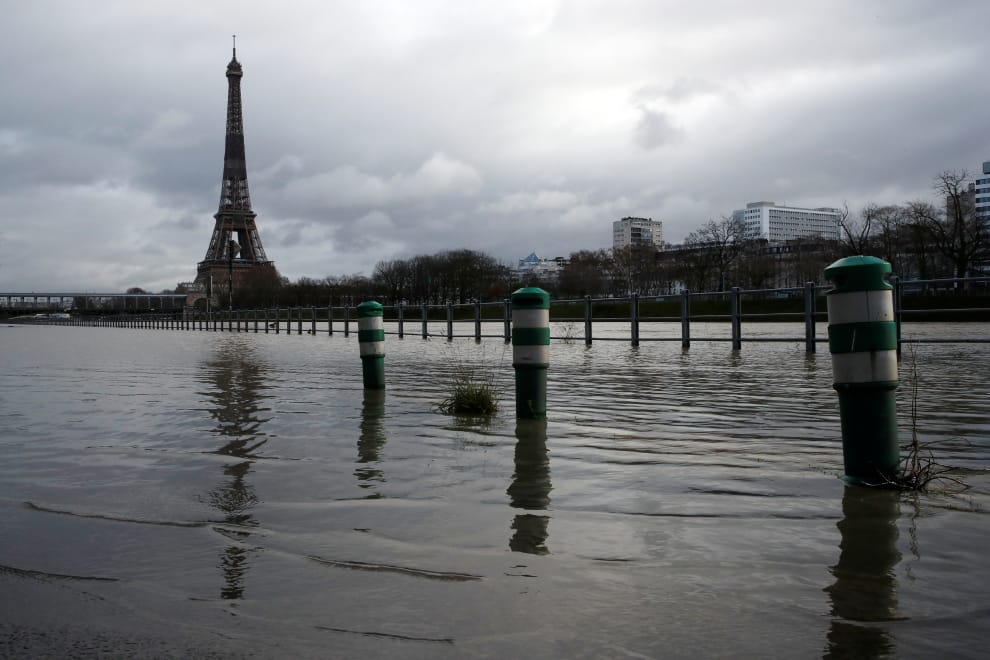 因為連日豪雨,流經巴黎的塞納河(Seine)不堪負荷,部分河段因此潰堤,造成市區多日淹水。畫面中可以看到整個路面被淹沒的街道,後方還矗立著著名地標巴黎鐵塔。