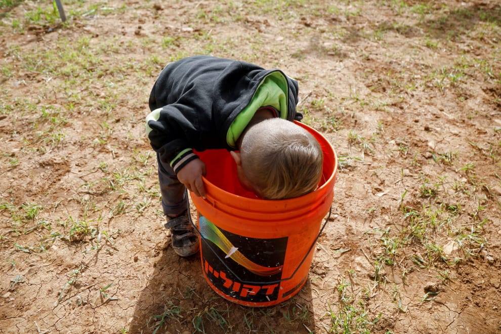 在約旦河西岸的約旦河谷(Jordan Valley),一名巴勒斯坦小孩正把頭探進水桶裡喝水,附近原本是他與家人所居住的帳篷,但在近日被以色列軍方拆除。