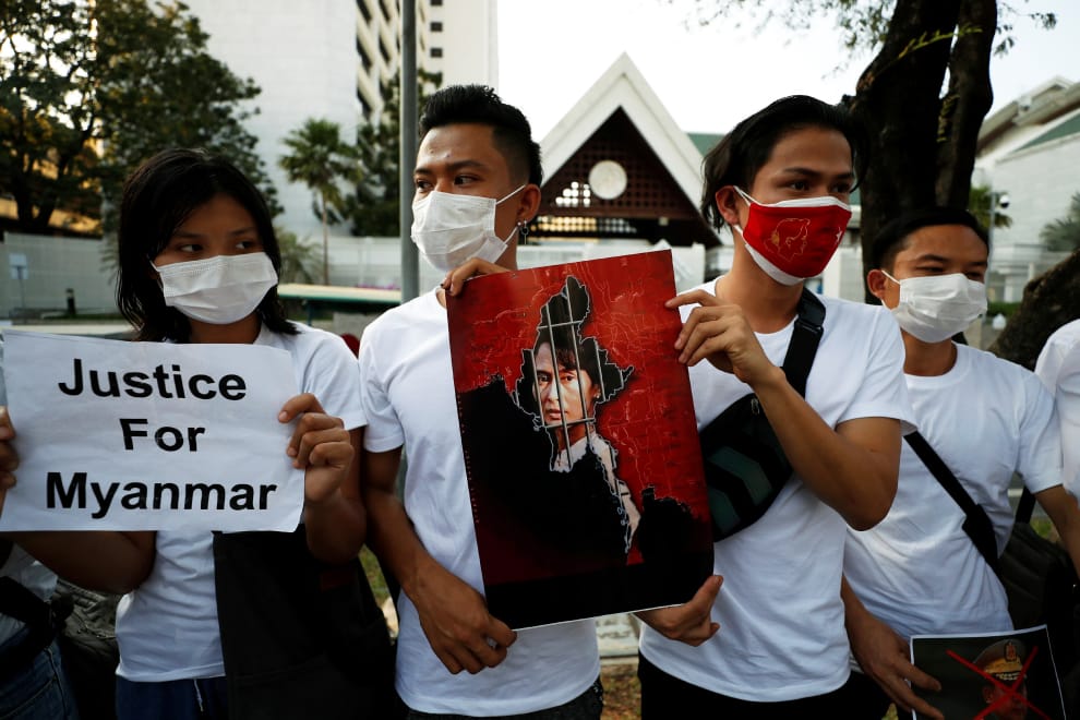在首都曼谷,旅泰的緬甸人手上拿著翁山蘇姬(Aung San Suu Kyi)的照片在聯合國亞太總部外示威,抗議緬甸軍方發動政變並逮捕翁山蘇姬。